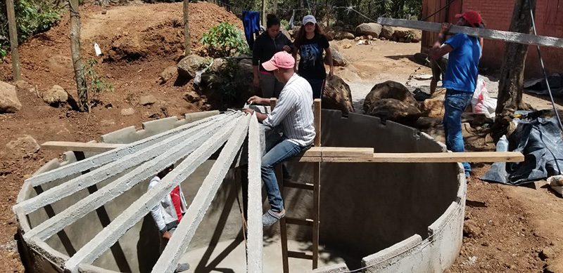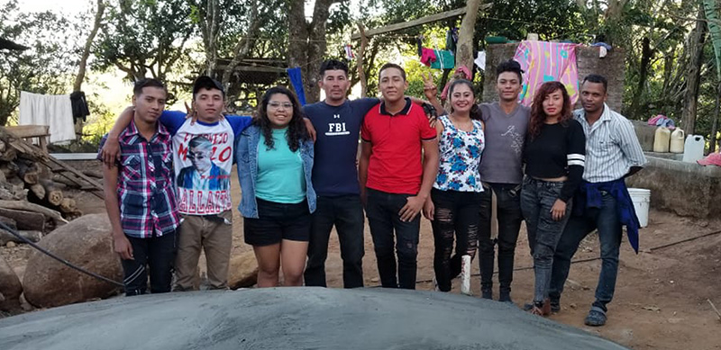 Grupo Joven Miyolt Nicaragua: Sirlene, Jonathan, Dennis, Gilmer, contando con el apoyo del grupo de grabación y equipo comunitario en la construcción de Cisternas de Agua.